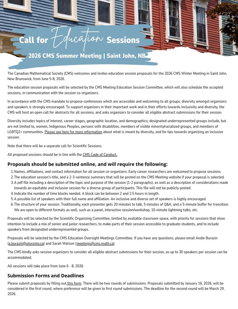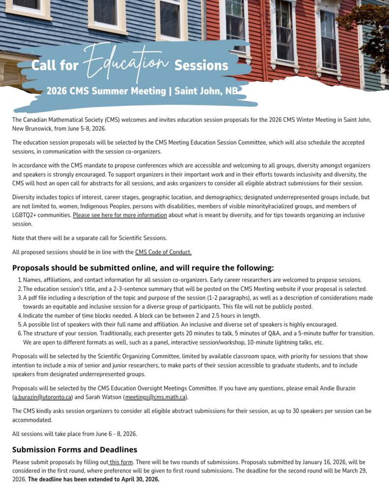 2026 CMS Summer Meeting, June 5-8 | Call for Education Sessions CMS Meetings February 13, 2026 Issue CMS Meetings February 2026 (Vol. 3, No. 6) Issue Contents February 13, 2026 Issue : Vol. 3, No. 6 Feature NEW: Girls Math Team Canada Announced for 2026 EGMO CMS Meetings 2026 CMS Summer Meeting, June 5-8 | Call for Education Sessions 2026 CMS Winter Meeting, Dec 11-14 | Save the Date! 2026 CMS Summer Meeting, June 5-8 | Call for Sessions 2026 CMS Summer Meeting, June 5-8 | Save the Date! Announcements NEW: 2026 Prairie Discrete Mathematics Workshop — Alice Lacaze-Masmonteil Renew Your CMS Membership for 2026! Mathematics of Human-Environmental Systems and Climate Change Impacts Summer School — Mark Lewis 2026 Increasing Diversity in Mathematical & Related Sciences Summer School — Women in Math Committee ICMMP 2026 — International Conference on Modern Mathematical Physics Programming in University Mathematics Education in the Gen AI Era — Chantal Buteau 2026 CMS Summer Ottawa Math Camp | Registration Now Open Call for Applications - A New Course-Based Master Program in Data Science at the University of Alberta — Jane Cooper International Day of Mathematics 2026 – Mathematics and Hope 2026 FYMSiC Conference @ McMaster University (May 8 -- 10, 2026) — Rebecca Carter Call for Contribution: European Journal of Combinatorics Special Issue in honour and memory of Robert Woodrow — Gena Hahn Calls for Nominations Call for Nominations: 2026 Adrien Pouliot Award | Deadline: April 30, 2026 Call for Nominations: 2026 Graham Wright Award | Deadline: March 31, 2026 Call for Nominations: 2026 Fellows of the CMS | Deadline: March 31, 2026 Call for Nominations: Canadian Journal of Mathematics (CJM) Editors-in-Chief (EIC) | Deadline April 15, 2026 Share on Facebook Share on email Post this on X/Twitter Instagram Send to printer