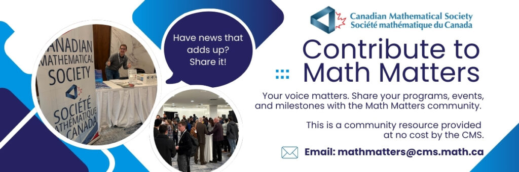 Issue Contents March 6, 2026 Issue : Vol. 3, No. 9 CMS Meetings 2026 CMS Summer Meeting | Registration now Open 2026 CMS Summer Meeting, June 5-8 | Call for Education Sessions 2026 CMS Summer Meeting, June 5-8 | Call for Sessions 2026 CMS Winter Meeting, Dec 11-14 | Save the Date! Announcements Mathematics of Human-Environmental Systems and Climate Change Impacts Summer School — Mark Lewis International Workshop on Operator Theory and its Applications (IWOTA 2026) - An ICM Satellite Conference — Conference Organizers Conference on Classical Analysis in Memory of Paul Koosis | May 1-2, 2026 — Conference Organizers Renew Your CMS Membership for 2026! Programming in University Mathematics Education in the Gen AI Era — Chantal Buteau Call for Applications - A New Course-Based Master Program in Data Science at the University of Alberta — Jane Cooper International Day of Mathematics 2026 – Mathematics and Hope 2026 FYMSiC Conference @ McMaster University (May 8 -- 10, 2026) — Rebecca Carter 2026 CMS Summer Ottawa Math Camp | Registration Now Open Conference Sponsorship - Tutte Institute for Mathematics and Computing — The Tutte Institute for Mathematics and Computing 2026 Prairie Discrete Mathematics Workshop | May 7 - 8 — Alice Lacaze-Masmonteil Calls for Nominations Call for Nominations: 2026 Fellows of the CMS | Deadline: March 31, 2026 Call for Nominations: Canadian Journal of Mathematics (CJM) Editors-in-Chief (EIC) | Deadline April 15, 2026 Call for Nominations: 2026 Adrien Pouliot Award | Deadline: April 30, 2026 Call for Nominations: 2026 Graham Wright Award | Deadline: March 31, 2026