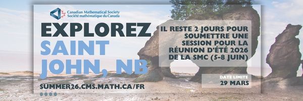 Table des matières Numéro du 27 mars 2026 : tome 3, no. 12 Communiqué NOUVEAUTÉ : Vitrine des carrières – Dre Pamela Brittain Réunions de la SMC Réunion d’été 2026 de la SMC, 5-8 juin | Les inscriptions sont maintenant ouvertes ! Réunion d’été 2026 de la SMC, 5-8 juin | Appel aux sessions d'éducation Réunion d’été 2026 de la SMC, 5-8 juin | Appel à sessions Réunion d'hiver 2026 de la SMC, 11-14 décembre| Réservez la date! Annonces M2PI (Math to Power Industry) — Raymond Spiteri Mathematics of Human-Environmental Systems and Climate Change Impacts Summer School — Mark Lewis International Workshop on Operator Theory and its Applications (IWOTA 2026) - An ICM Satellite Conference — Conference Organizers Conference on Classical Analysis in Memory of Paul Koosis | May 1-2, 2026 — Conference Organizers Camp d'été de mathématiques 2026 de la SMC | Les inscriptions sont ouvertes 2026 FYMSiC Conference @ McMaster University (May 8 -- 10, 2026) — Rebecca Carter Parrainage de conférences – l’Institut Tutte pour les mathématiques et le calcul — The Tutte Institute for Mathematics and Computing 2026 Prairie Discrete Mathematics Workshop | May 7 - 8 — Alice Lacaze-Masmonteil Call for Abstracts - Analysis and Applications of Partial Differential Equations - Alberta Mathematics Dialogue (AMD) — Tianxu Wang Appel de mises en candidature Appel à mises en candidature : Prix Adrien Pouliot 2026 | Date limite : 30 avril 2026 Appel à mises en candidature : Prix Graham Wright 2026 | Date limite : 31 mars 2026 Appel à mises en candidature : Fellows 2026 de la SMC | Date limite : 31 mars 2026 Appel aux mises en candidature : Rédacteur(trice)s en chef pour le Journal canadien de mathématiques (JCM) | date limite 15 avril 2026 Comité étudiant de la SMC Réunion d’été 2026 de la SMC – Activités étudiantes — CMS Student Committee (StudC)